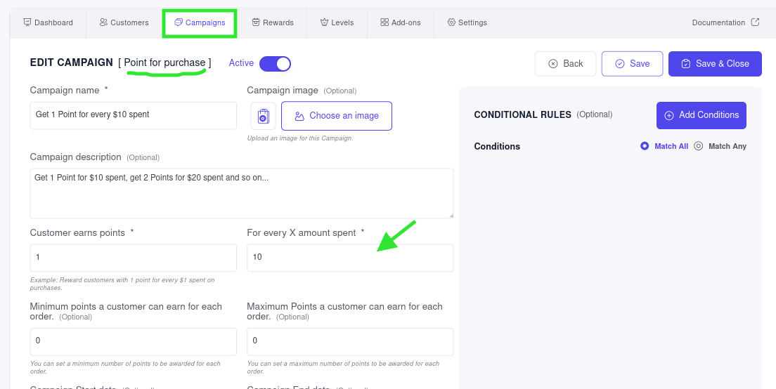 For example: When customer spend maximum of $500 then they will earn 10 points and if he spend 600 or more, customer would still earn 10 points. ie..,instead of dynamic points, Fixed Points will be given.&#x20;