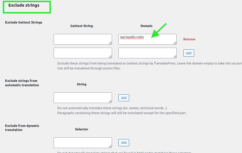 **Step 3:** Go to "Exclude strings" section -> Exclude Gettext Strings -> Domain