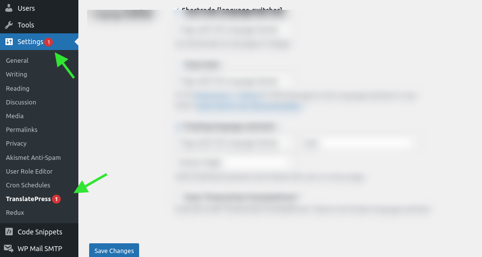 **Step 1:** Go to Wordpress -> Settings -> TranslatePress.&#x20;